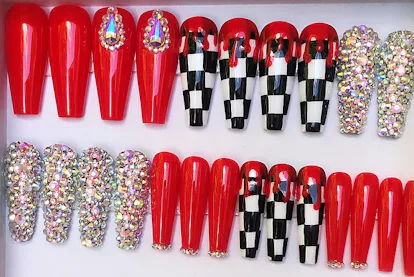 There’s no time like the present to live your absolute best fake-nail life, so go as all-out as you could ever want. Mishae Monet has a vast collection of products like the Hot Tamale nails ($15, Mishae Monet) that are bright, sparkly, super graphic, and only for the coolest and most daring among us.
