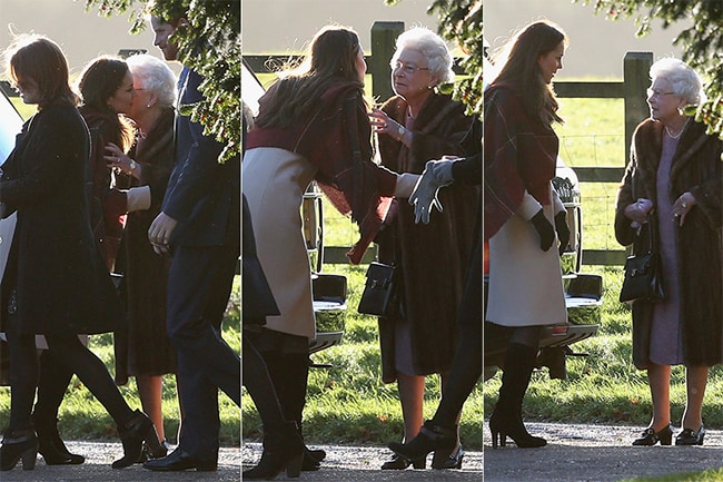 Fans are hardly ever treated to photos of Kate informally greeting the Queen, but on Christmas Day in 2013, the Duchess was snapped bending down to kiss her grandmother-in-law.