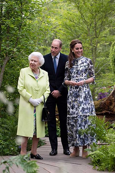 In May 2019, Kate welcomed her grandmother-in-law to the Chelsea Flower Show, where she gave her a guided tour of the garden she had helped co-design, the Back to Nature display. Kate greeted the Queen, who is patron of the Royal Horticultural Society, with a kiss on both cheeks as well as a curtsy. Prince William also stooped down to give his grandmother a peck on each cheek.