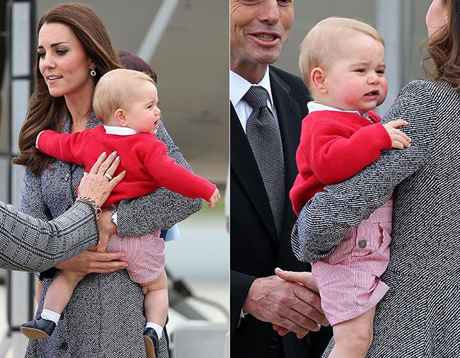 During the royal tour of Australia in 2014, an eight-month-old George was pictured bawling his eyes out as the family departed Canberra airport. While the then-Prime Minister Tony Abbott shook hands with Kate, the Duchess tried to soothe her crying baby. Poor grumpy George!