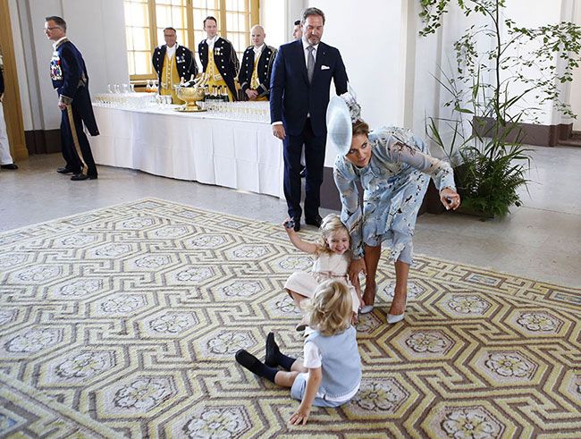 Princess Leonore of Sweden looked very unconcerned as her mum, Princess Madeleine, tried to get her to stand up during an event. The little princess was sat on a rug playing with a friend, and giggled as she was pulled up by her mum, who attempted to get her attention by pointing to something in the distance.