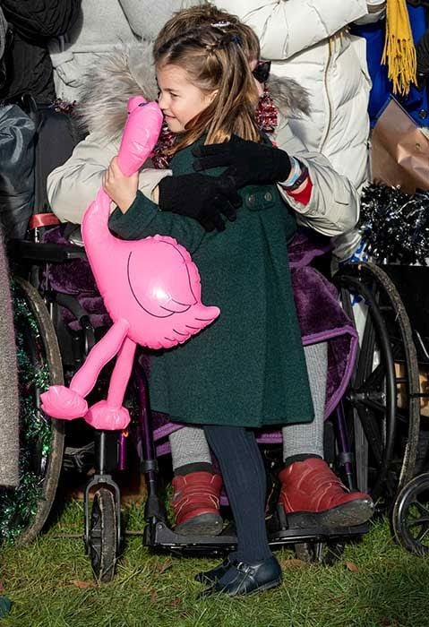 During her debut at the Christmas Day 2019 church service in Sandringham, Princess Charlotte melted hearts when she was pictured hugging one woman in a wheelchair, as she greeted members of the public. The then four-year-old royal was given a number of gifts during the walkabout, including an inflatable pink flamingo.