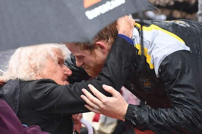 Prince Harry might just wear the crown for best royal hugger though. One of his most memorable interactions with a fan was in June 2017 when he visited Sydney, Australia. Despite the torrential rain and thunderstorm, which left him drenched to the skin, Harry remained in high spirits and brightened up the day of 98-year-old Daphne Dunne.