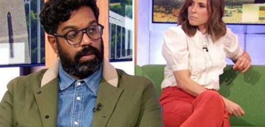 The One Show presenters Alex Jones, 44, and Jermaine Jenas, 38, appeared on tonight’s offering. The pair were joined in the studio by former politician Gyles Brandreth, 73, and comedian Romesh Ranganathan, 44.