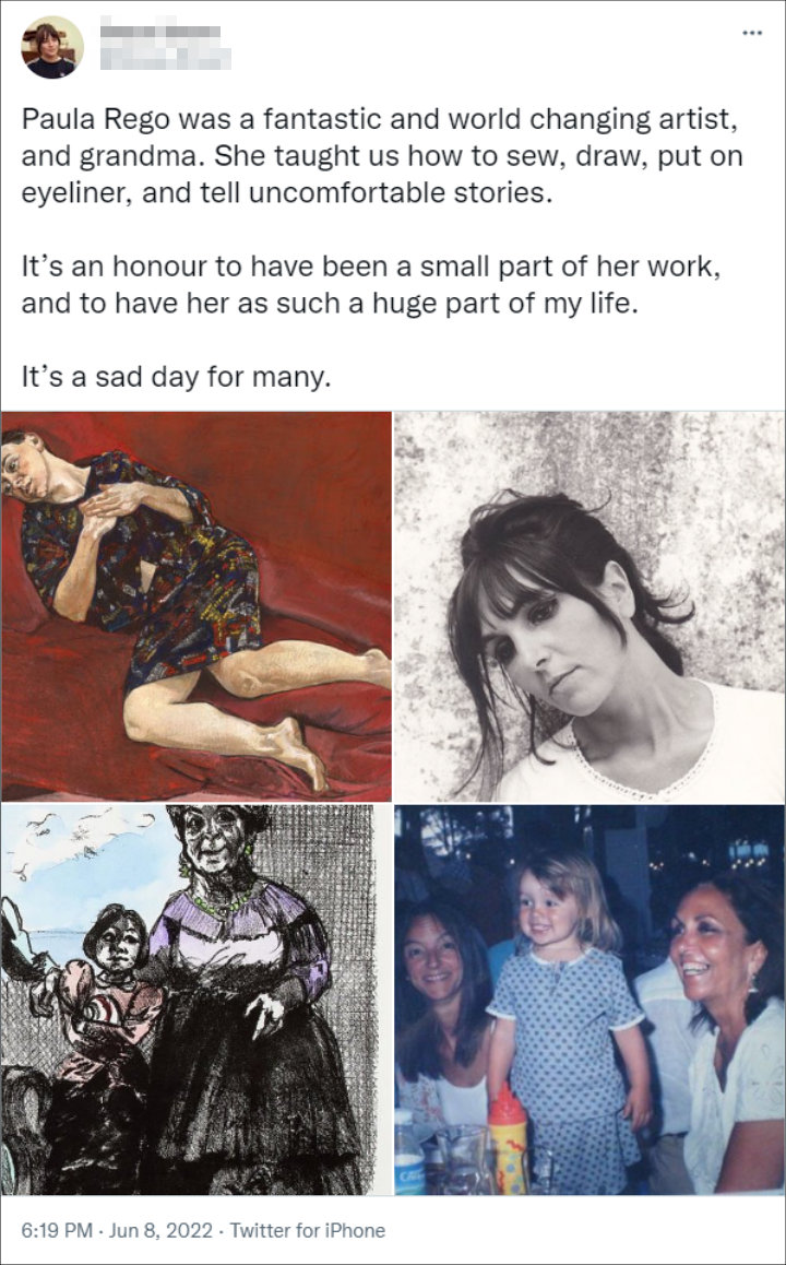 Grace was the first to lead the tributes to her grandmother as she took to Twitter to pay her respects. She wrote, “Paula Rego was a fantastic and world-changing artist, and grandma. She taught us how to sew, draw, put on eyeliner, and tell uncomfortable stories.”