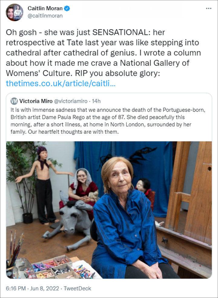 “It is with immense sadness that we announce the death of the Portuguese-born, British artist Dame Paula Rego at the age of 87. She died peacefully this morning, after a short illness, at home in North London, surrounded by her family,” the Victoria Miro gallery said in a statement. “Our heartfelt thoughts are with them.”