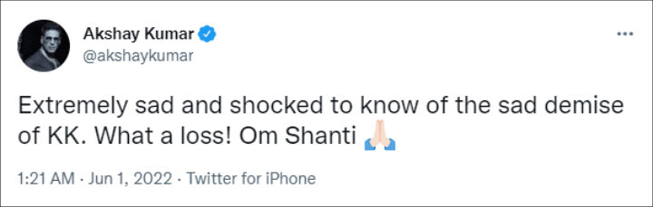 Tributes have poured in from across the industry on social media about the “sad” news about the Screen Award winner. Among those was actor Akshay Kumar who tweeted, “Extremely sad and shocked to know of the sad demise of KK. What a loss! Om Shanti.”