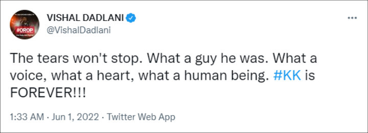 Singer and composer Vishal Dadlani joined in to express his sadness. He wrote on the microblogging site, “The tears won’t stop. What a guy he was. What a voice, what a heart, what a human being. #KK is FOREVER!!!”