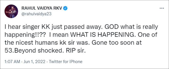 Reality television personality and singer Rahul Vaidya added his condolences to “one of the nicest humans.” He said, “I hear singer KK just passed away. GOD what is really happening!!?? I mean WHAT IS HAPPENING. One of the nicest humans kk sir was. Gone too soon at 53.Beyond shocked. RIP sir.”
