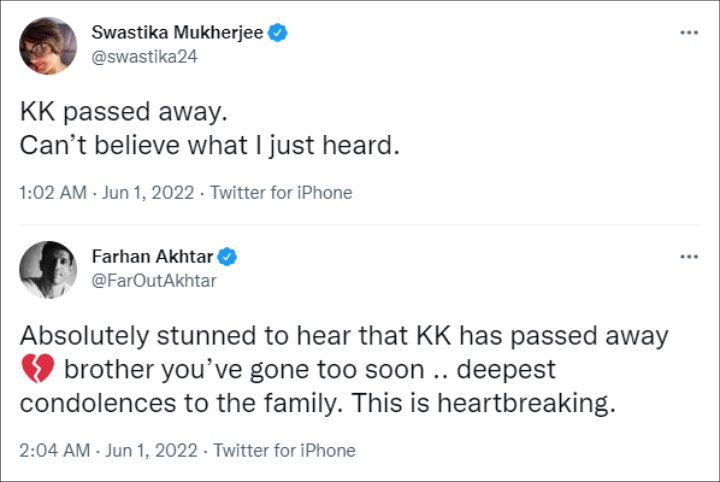 Actress Swastika Mukherjee couldn’t “believe” the heartbreaking news. She said, “KK passed away, Can’t believe what I just heard.” Meanwhile, actor Farhan Akhtar said, “Absolutely stunned to hear that KK has passed away brother you’ve gone too soon .. deepest condolences to the family. This is heartbreaking.”
