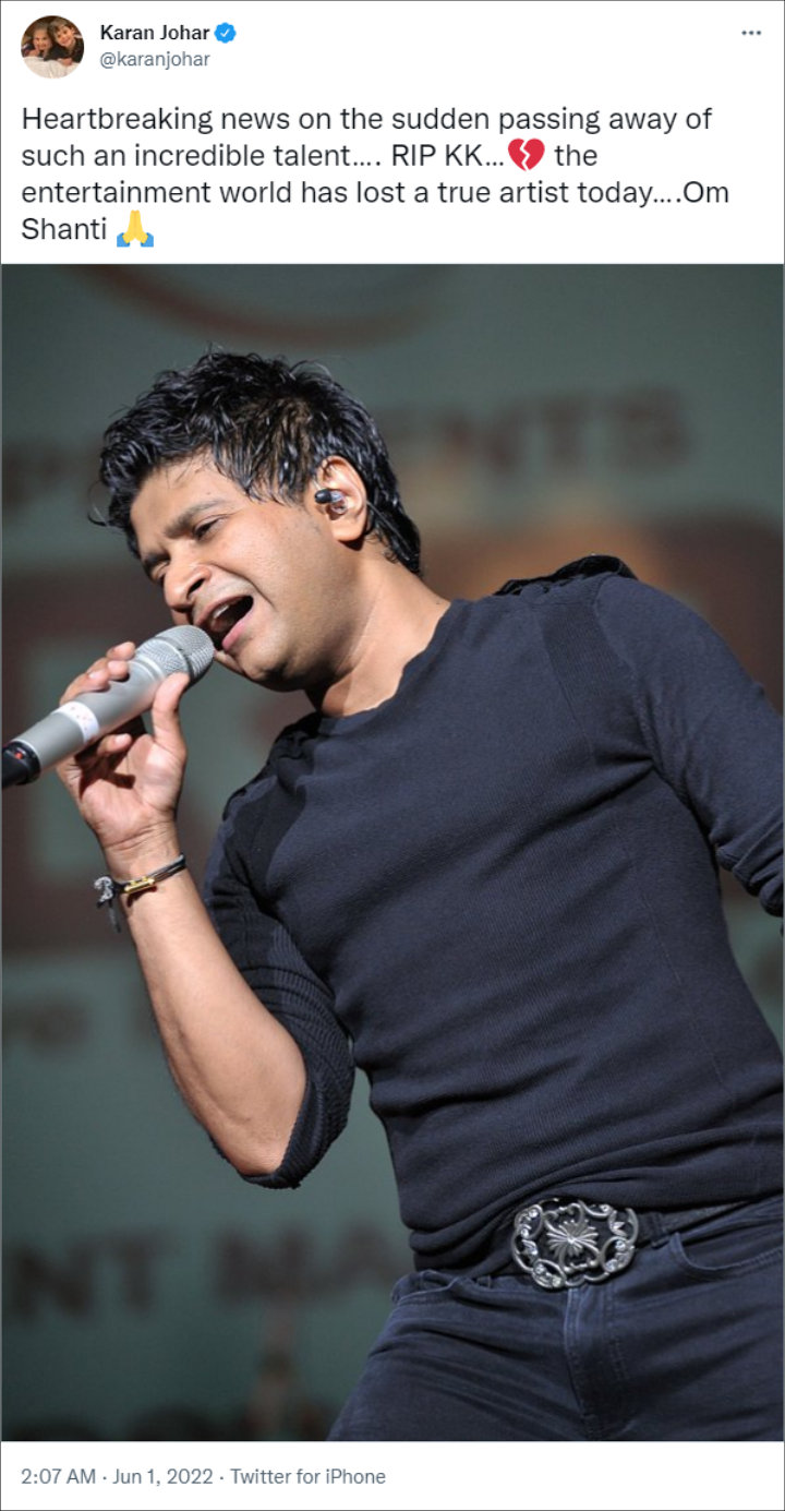 Karan Johar additionally wrote, “Heartbreaking news on the sudden passing away of such an incredible talent. RIP KK the entertainment world has lost a true artist today. Om Shanti.”