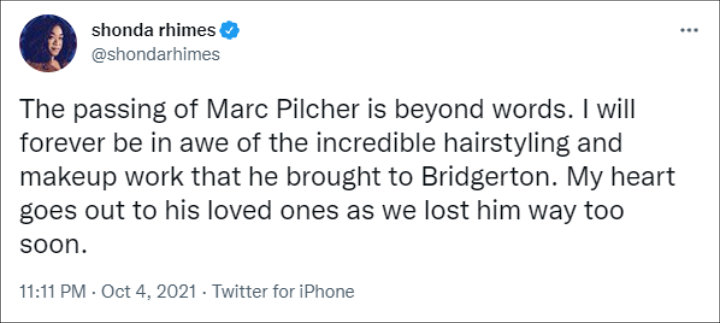 Following his sudden passing, “Bridgerton” producer Shonda Rhimes took to her Twitter account to express her condolences. “The passing of Marc Pilcher is beyond words,” she began. “I will forever be in awe of the incredible hairstyling and makeup work that he brought to ‘Bridgerton’. My heart goes out to his loved ones as we lost him way too soon.”