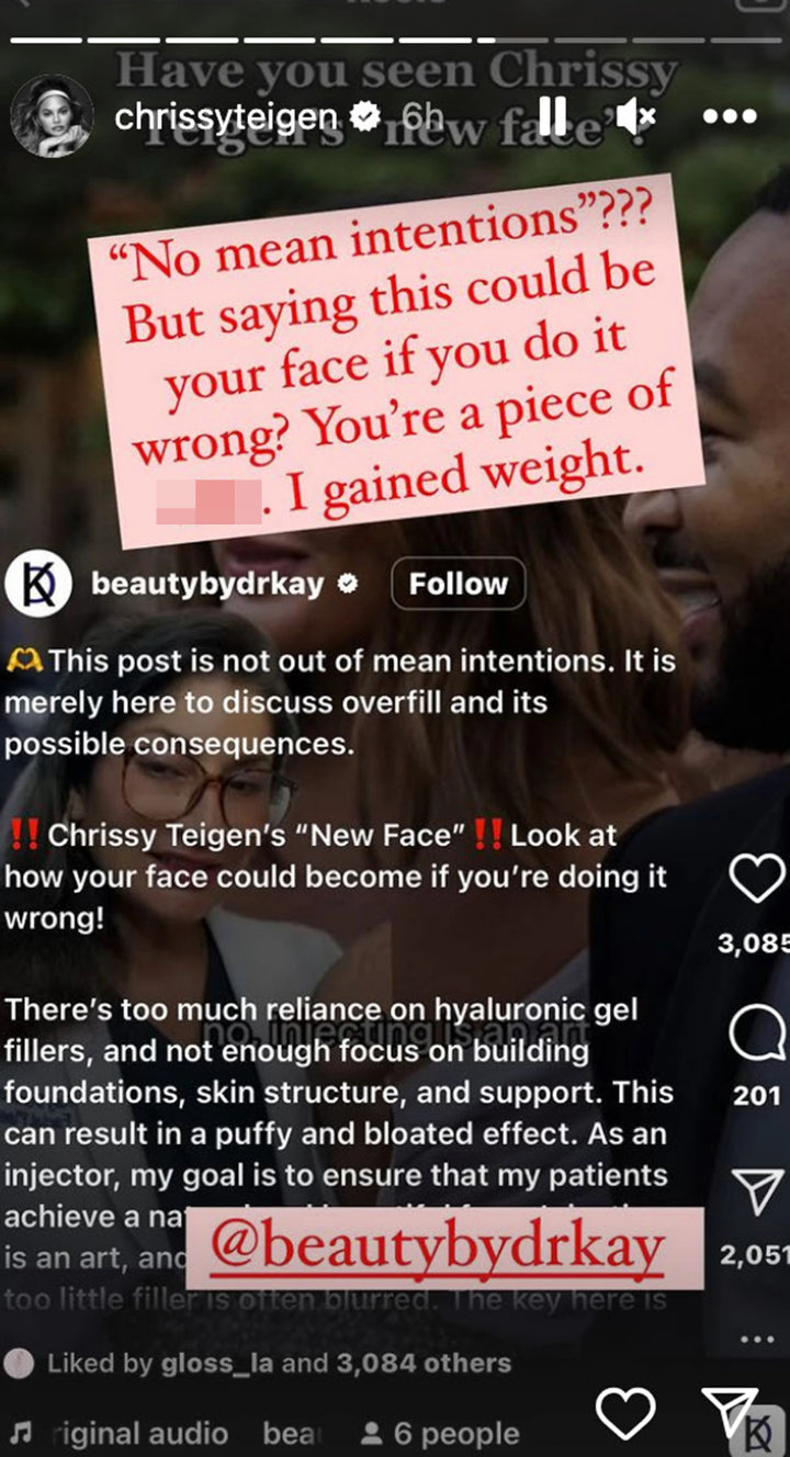 “!! Chrissy Teigen’s ‘New Face’ Look !! Look at how your face could become if you’re doing it wrong! There’s too much reliance on hyaluronic gel fillers, and not enough focus on building foundations, skin structure, and support,” the influencer further added. “This can result in a puffy and bloated effect.”