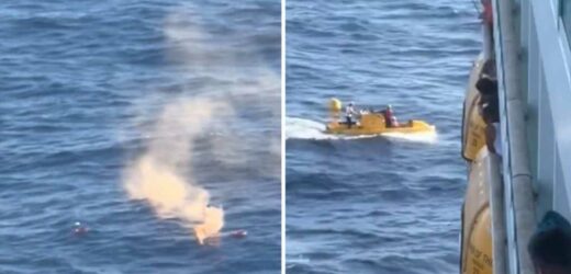 You see what appears to be a couple of empty life rafts next to some smoke — apparently emanating from flares — as guests onboard the cruise ship anxiously looked out to the ocean, hoping to spot her. Thankfully, the team eventually found her and picked her up in their rescue vehicle.