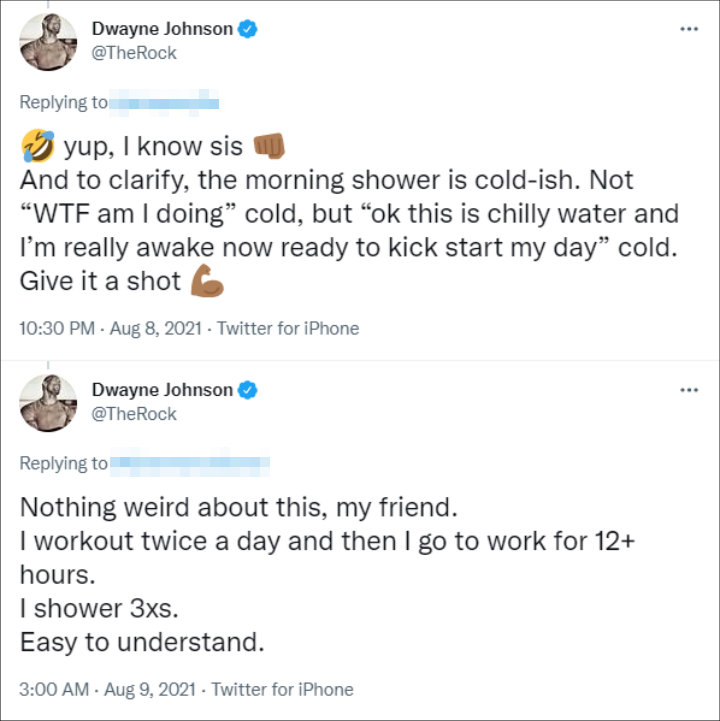 Shortly after Dwayne shared that he always takes a cold shower in the morning, a Twitter user questioned the reason why he does that. The former WWE star then explained, “To clarify, the morning shower is cold-ish. Not ‘WTF am I doing’ cold, but ‘ok this is chilly water and I’m really awake now ready to kick start my day’ cold. Give it a shot.”