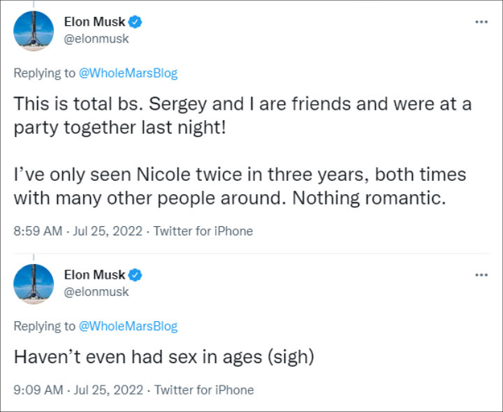 He tweeted, “This is total bs. Sergey and I are friends and were at a party together last night! I’ve only seen Nicole twice in three years, both times with many other people around. Nothing romantic. Haven’t even had sex in ages (sigh).”