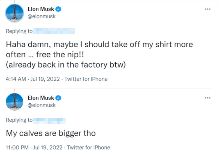 On Tuesday, July 19, the Tesla mogul made a tongue in cheek comment after a fan called him out as tweeting, “F**k yea I got my $ behind this man. So so many other smart investors. @elonmusk.” In response, he wrote, “Haha damn, maybe I should take off my shirt more often … free the nip!!” before pointing out that he’s “already back in the factory” amid his legal battle with Twitter after he pulled out his deal to acquire the micro-blogging site for $44 million due to the company not sharing information regarding bots on its platform.