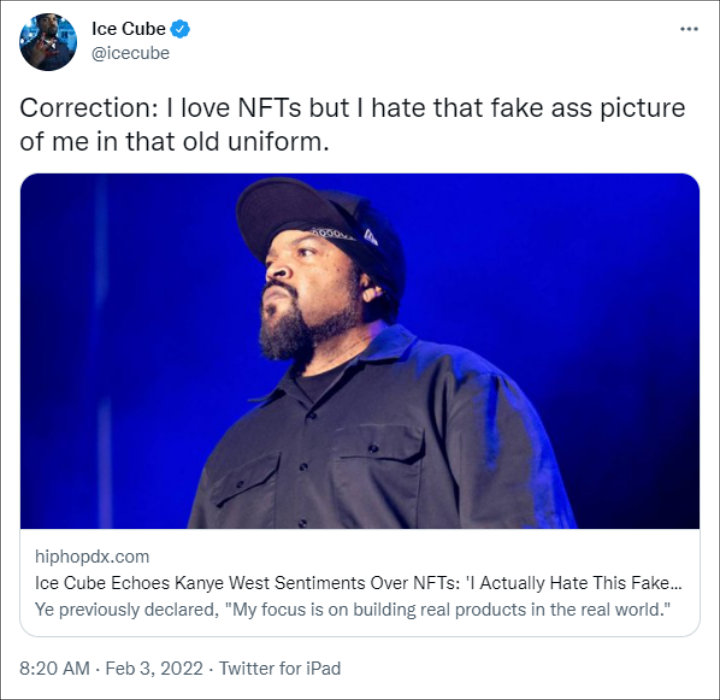 Hours later, however, Ice Cube corrected his previous statement. “Correction: I love NFTs but I hate that fake a** picture of me in that old uniform,” the emcee, born O’Shea Jackson Sr, pointed out.