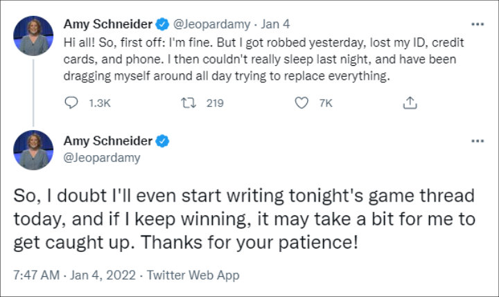 AceShowbiz -“Jeopardy!” winner Amy Schneider revealed that she fell victim of robbery over New Year’s weekend. Amy, who breaks record the most consecutive wins by a woman on the long-running game show, shared the terrifying news on her Twitter account on Monday, January 3.