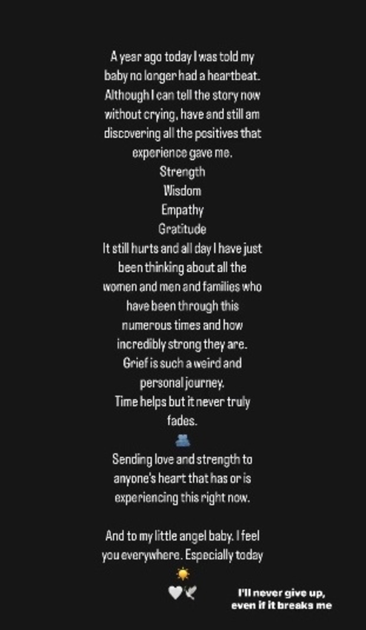 “A year ago today I was told my baby no longer had a heartbeat. Although I can tell the story now without crying, have and still am discovering all the positives that experience gave me. Strength. Wisdom. Empathy. Gratitude,” she wrote on her Instagram Story.