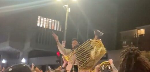 Thousands of Univ. of Kansas fans swarmed a street near campus to celebrate the Jayhawks’ NCAA championship Monday night — with one fan actually surfing through the crowd in a shopping cart!!