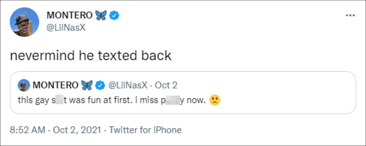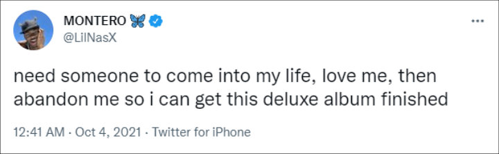 In another tweet posted on Sunday, Lil Nas opened up about lacking inspiration for his music. “need someone to come into my life, love me, then abandon me so i can get this deluxe album finished,” so he wrote, prompting his followers to offer themselves to be a possible romantic partner for the rapper.