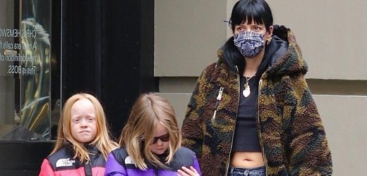 Smile singer Lily, 35, was seen with nine year old Ethel and Marnie, eight, donning brightly coloured North Face jackets to keep the April chill at bay.