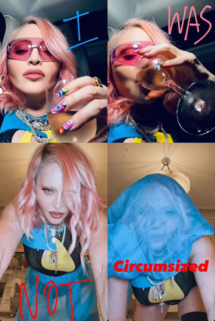 Over the images, Madge declared, “I was not circumsized,” which doesn’t make any sense since it’s a surgery to remove the foreskin from a baby boy’s penis.