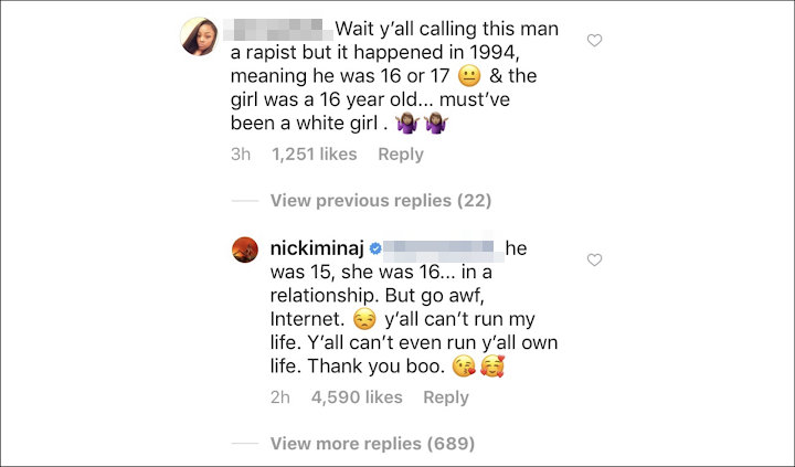 He then moved to California in October 2019 after marrying Nicki, with whom he had a son nicknamed “Papa Bear” in September 2020. Nicki said about the sexual abuse claims against him on Instagram in December 2018, “He was 15, she was 16… in a relationship. But go awf, internet, y’all can’t run my life. y’all can’t even run y’all own life.”