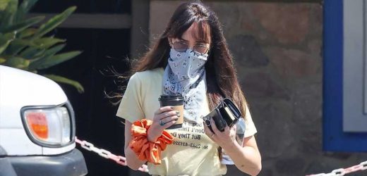 Johnson was photographed a coffee run in Malibu on Monday, wearing a pale yellow graphic printed T-shirt with beige belted trousers and a pair of Gucci loafers. She also donned a blue paisley scarf as a protective face mask, although the real finishing piece of the outfit (aside from her giant emerald ring) was the giant orange scrunchie she wore on her wrist, giving the smart-casual look an unexpected pop of color.