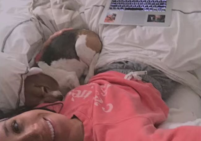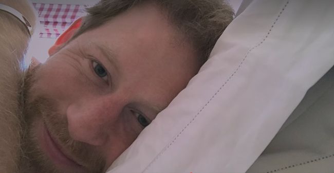 Prince Harry was seen lying in bed with his head on a white pillow, chatting to Meghan on FaceTime, and another picture revealed Meghan Markle also in bed with her laptop and her pet dog Guy. The smiling beauty could be seen wearing a pink sweatshirt and a pair of grey jogging bottoms.