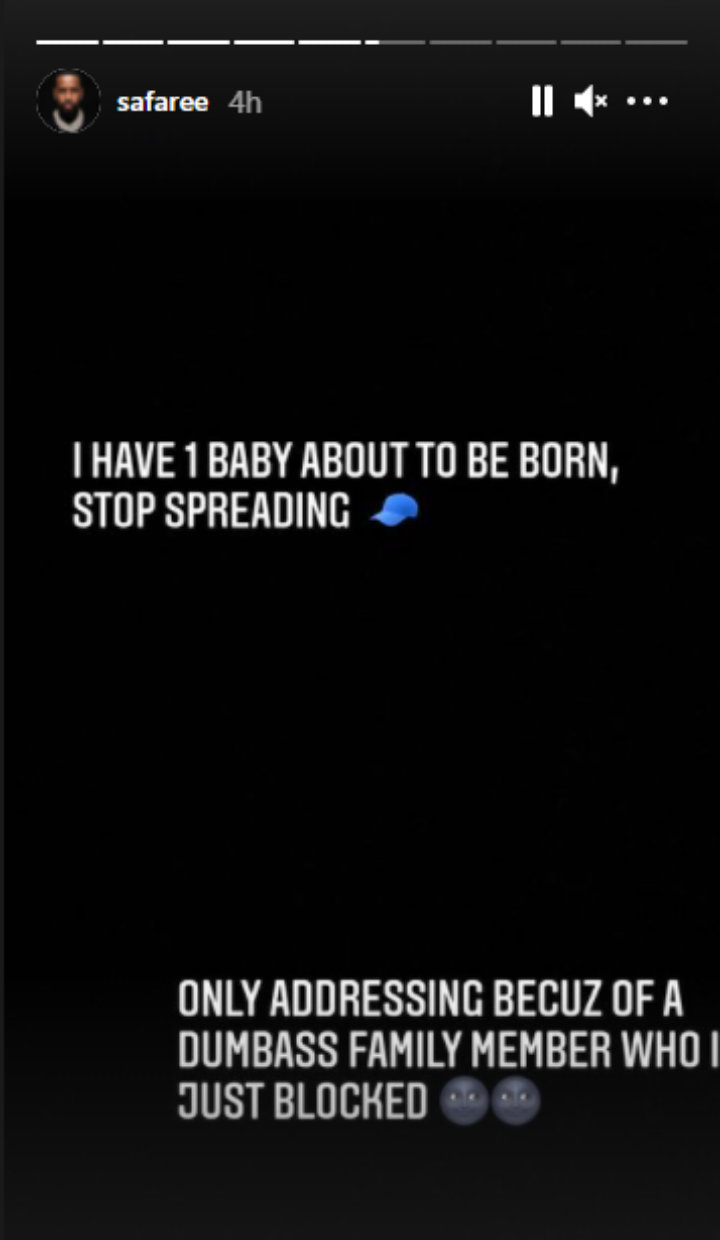 The 39-year-old MC responded to the rumors via Instagram Story. “I have 1 baby about to be born. Stop spreading [cap emoji],” he first declared. “Only addressing [because] of a dumba** family member who I just blocked.”