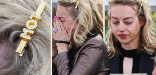Tom Parker’s widow Kelsey Parker paid tribute to her late husband today with a poignant accessory dedicated to The Wanted star. Kelsey wore a sweet gold hair clip spelling out Tom’s name in her blonde hair as she held back tears while attending his funeral service at St Francis of Assisi church earlier today.