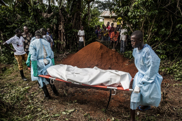 A Red Cross burial team prepares to bury the body of a woman suspected of dying of Ebola in Sierra Leone in 2014.Credit:Pete Muller/Prime for the Washington Post