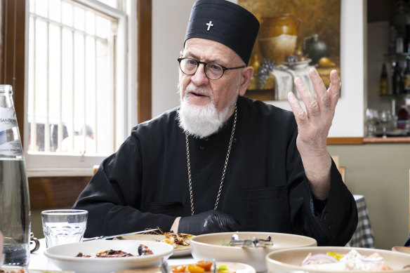 We meet at Kouzina Greco restaurant in Parramatta. As Adamopoulos, in his mid-70s, arrives in the tall black hat and long robes of an Orthodox bishop, the waiters make a show of deference. He smiles and greets them, showing flashes of rock-star charisma through his Coke-bottle glasses. His friend, with whom he is staying while in Sydney, joins us for lunch and orders for Adamopoulos. The friend is a chaperone; the bishop has taken vows that do not allow him to be alone with a woman.