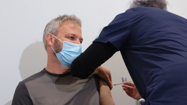 Victoria’s Chief Health Officer Brett Sutton gets his AstraZeneca needle at the Royal Exhibition Centre.Credit:Getty