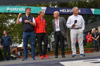 Former F1 race director Michael Masi (left), Australian Grand Prix Corporation chief executive Andrew Westacott, corporation chairman Paul Little and former F1 boss Chase Carey at a media conference following cancellation of the 2020 event.Credit:Joe Armao