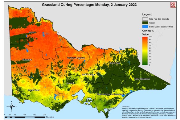 Maps by the state fire agency show the amount of grassland curing – a measure of the amount of dead grassland in the landscape that has dried out or died – remains higher in the north of the state.