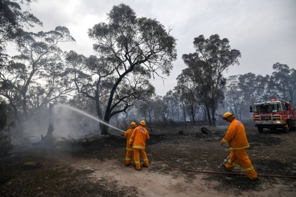 Firefighters work on a grass fire in Mill Park, Victoria, in 2019. Credit:Justin McManus