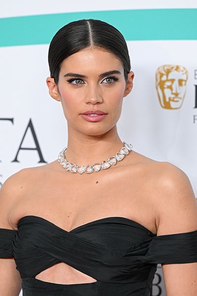 Model Sara Sampaio went for a super sleek middle-parted updo, thick black liner and a neutral lip.