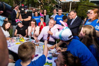 Five-year-old Kieran Delaney, centre front, nominates retiring minister Greg Hunt as his pick to win the coming election.Credit:James Brickwood