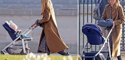 Carrie wrapped up against the chilly spring air in a trendy coat and kept her hands warm in a pram attachment. She wore her blonde locks loose around her shoulders