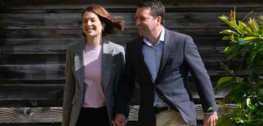 Opposition Leader Matthew Guy and wife Renae in Bentleigh on Sunday.Credit:Luis Enrique Ascui