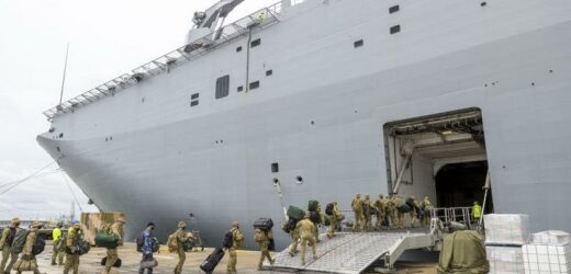 Soldiers entering the HMAS Adelaide at the Port of Brisbane on Thursday last week, before departing for Tonga.
