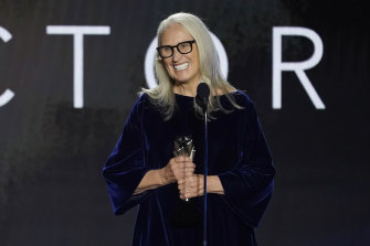 Jane Campion accepting the award for best director for The Power of the Dog at Monday’s Critics Choice Awards in Los Angeles.Credit:AP