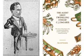 A caricature of DeGaris from the early 20th century and, right, the cover of The Alert, Grey Twinkling Eyes of C. J. DeGaris by David Nichols.