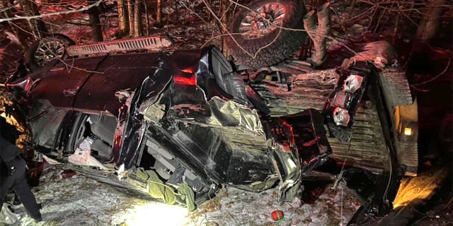 A view of the wrecked pickup after the crash, as discovered by responding officers from the New Hampshire State Police and other responding police and first-responder units. Tinsley, a young Shiloh Shepherd, led officers to this scene.
