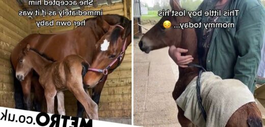 ‘The foal’s mother is taking care of the mare’s baby right now,’ she said.