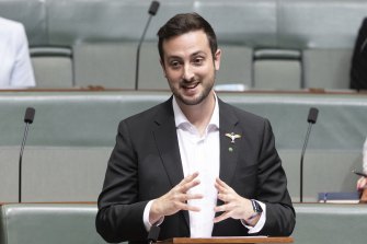 Brisbane Greens MP Stephen Bates delivering his first speech in the House of Representatives.Credit:Alex Ellinghausen