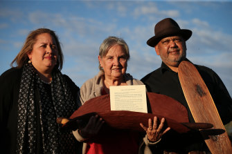 Megan Davis, Pat Anderson and Noel Pearson with a piti holding the Uluru Statement from the Heart in May 2017.Credit:Alex Ellinghausen
